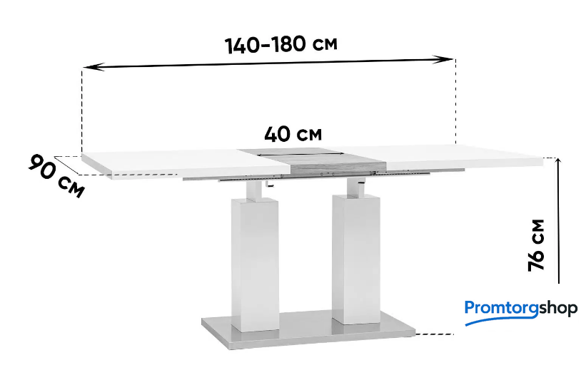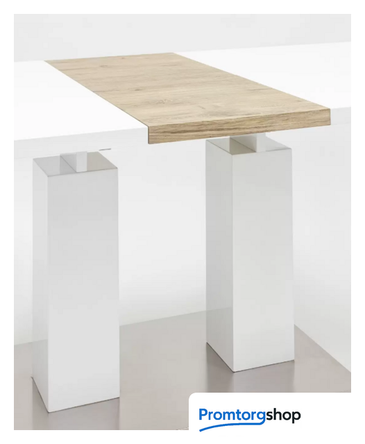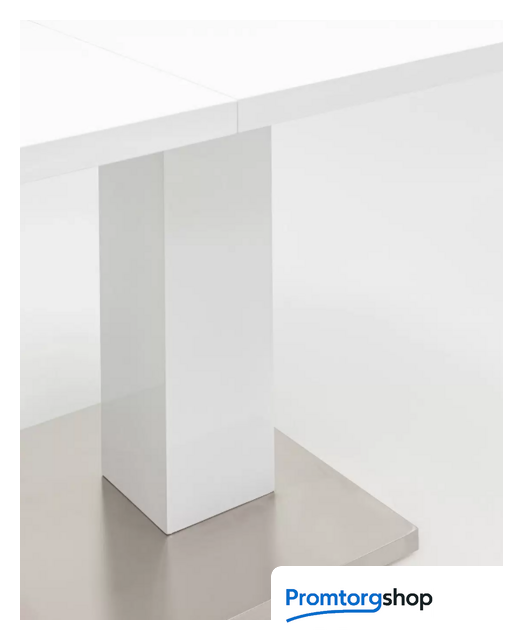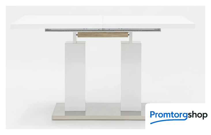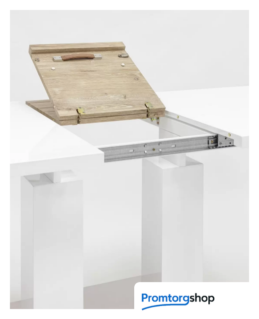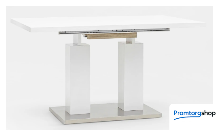 | Тип | обеденный стол для дома. Столешница выполнена из прочного и долговечного МДФ. Светлая глянцевая поверхность столешницы гармонично сочетается с металлическими ножками. Простая прямоугольная форма стола позволит легко вписать его в современный интерьер, стол украсит кухню, гостиную или современное кафе, ресторан.Дополнительная вкладка стола выполнена из МДФ с бумажным шпоном цвета беленого дуба. На вкладке предусмотрена петля для комфортного открытия стола одной рукой. Страна производства: Россия |