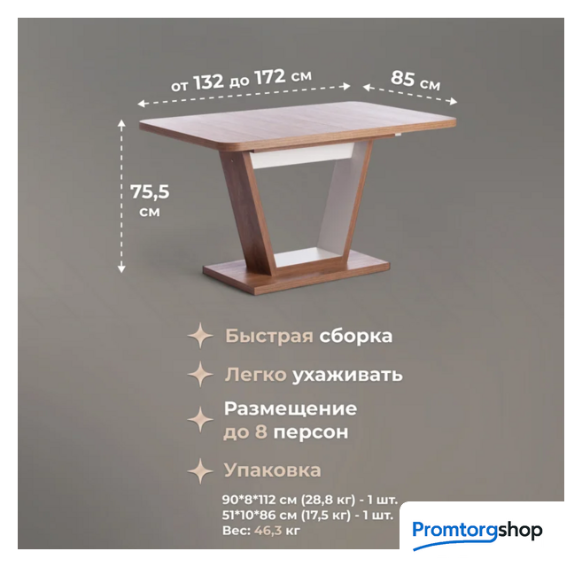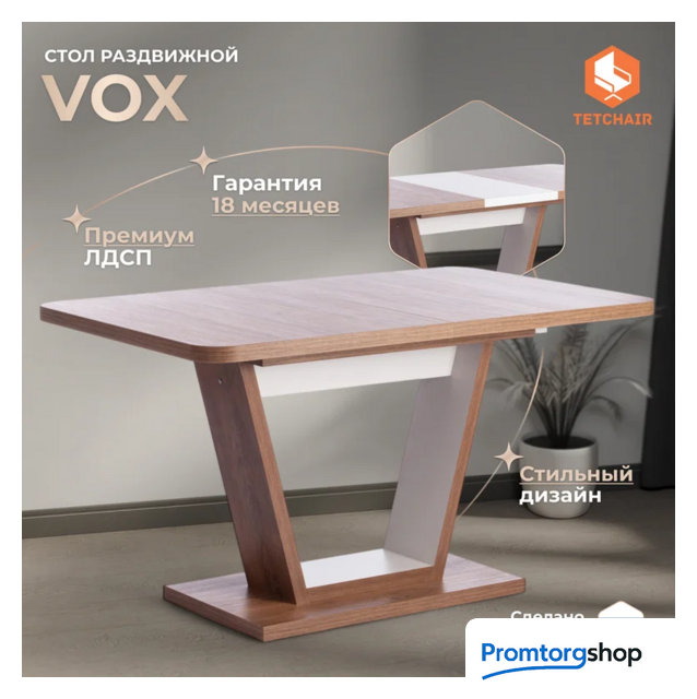 Тип | обеденный стол для дома. Визуально легкий стол-транформер Vox украсит собой любую домашнюю обстановку. Большая столешница, оригинальная ножка-опора и удачное сочетание цветов — идеальное решение для современного стильного интерьера. Размеры стола дают возможность с комфортом разместить от четырех до восьми человек. Вставка стола убирается горизонтально в подстолье. Края оклеены прочной пластиковой кромкой толщиной 2 мм. ЛДСП толщиной 18+18 мм. Механизм раздвижения — синхронного типа со стопором. Стол Vox отлично подойдет для гостиной, для кухни или для загородного дома. Стол очень прост в сборке, инструкция по сборке прилагается. Габариты и вес упаковок: 90×112×8 см (28.8 кг); 51×86×10 см (17.5 кг). Страна производства: Китай |