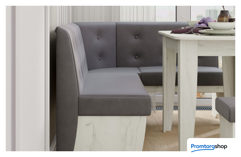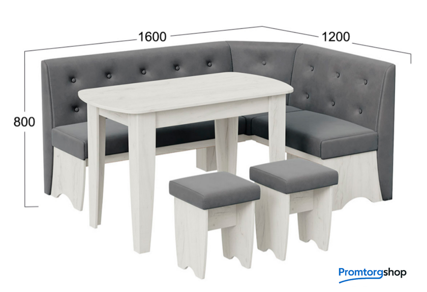 | Тип | обеденная группа для дома. Тип сборки: универсальная. Размеры мягкого уголка: 160×120×80 см; высота спинки: 39 см; глубина сиденья: 39 см. Расстояние между опорами по длине стола - 675 мм, по ширине - 331 мм.Оттенок обивки может отличаться в зависимости от теплоты и яркости освещения, угла обзора, цвета рядом стоящих объектов, а также из-за разной цветопередачи экрана, настроек монитора |
