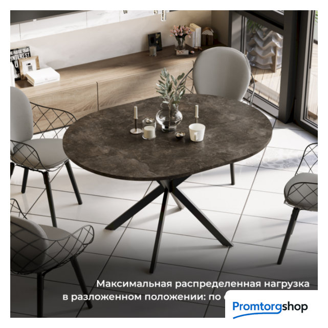| Форма стола | круглая (в сложенном виде), овальная (в разложенном виде). Максимальная нагрузка 20 кг (в сложенном виде), 40 кг (в разложенном виде).Форма поставки в разобранном виде |