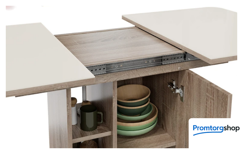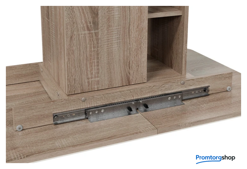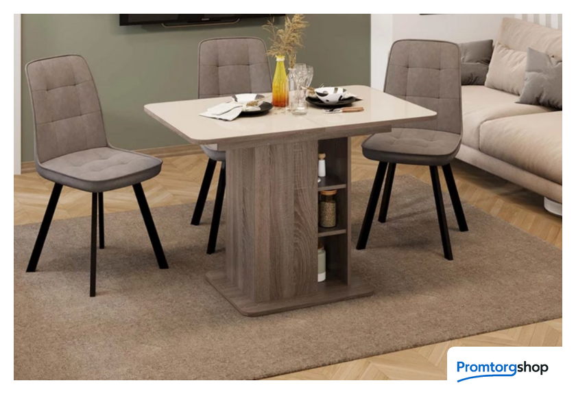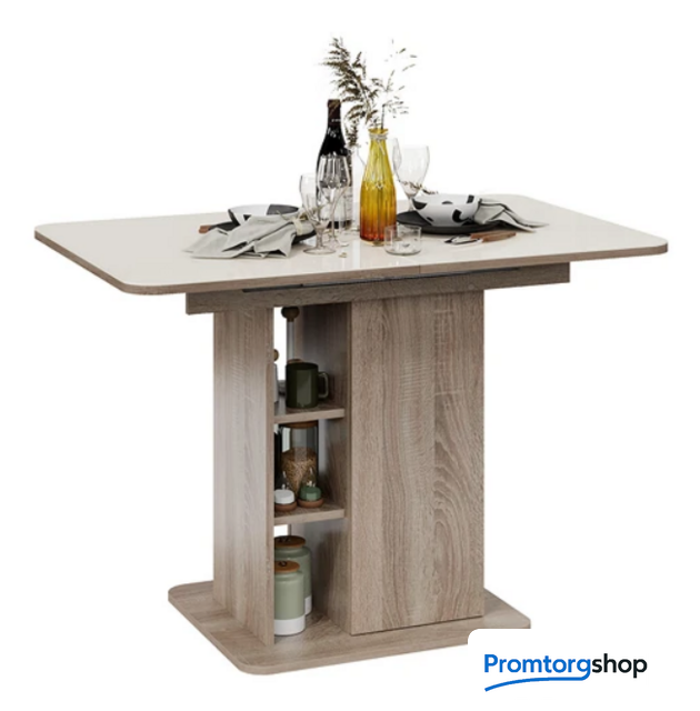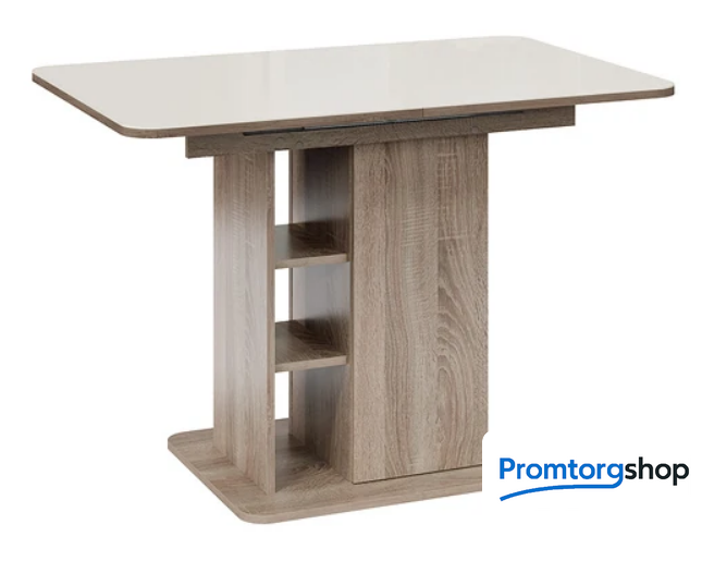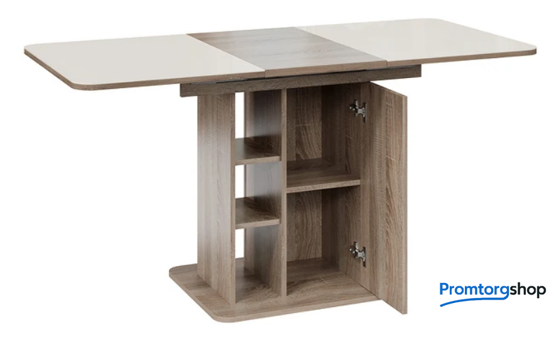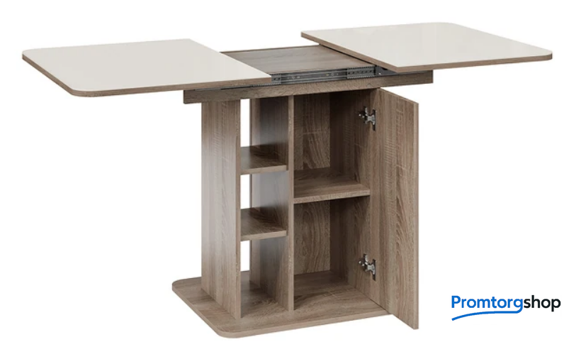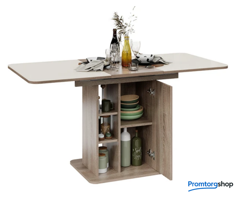 | Тип | обеденный стол для дома. Стол раздвижной «Мюнхен» Тип 1 станет не просто функциональным дополнением помещения, а той самой изюминкой интерьера, которую гарантированно оценят по достоинству знакомые и друзья. Его необычная конструкция с различными полками и местами для хранения сможет порадовать даже самых взыскательных покупателей. Конструкция модели предусматривает открытые полки и место для хранения за дверцей, открывающейся легким нажатием руки. Этот стол станет настоящей находкой для обустройства малогабаритных кухонь, где необходимо компактно и упорядочено расположить необходимые предметы. «Мюнхен» Тип 1 имеет синхронный механизм раздвижения со вставкой «бабочка», которая укладывается вручную. Несомненный плюс стола заключается в том, что он выполнен на одной опоре. За такой моделью можно разместить большее количество людей, ведь одна опора позволяет сэкономить пространство между сидящими. |