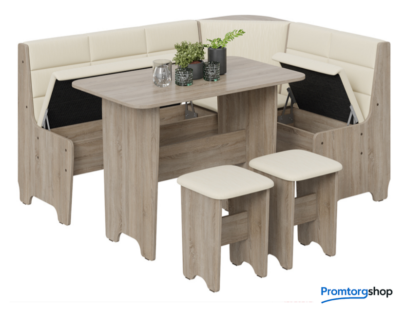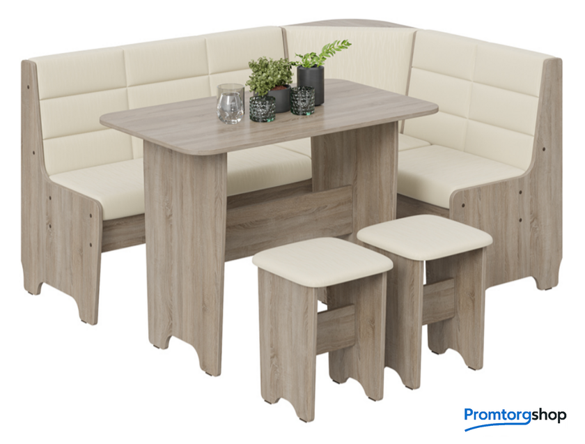 | Состав набора | уголок кухонный мягкий, 2 табурета, стол. Максимальная распределенная нагрузка на стол: 15 кг. Максимальная нагрузка на одно посадочное место: 75 кг |