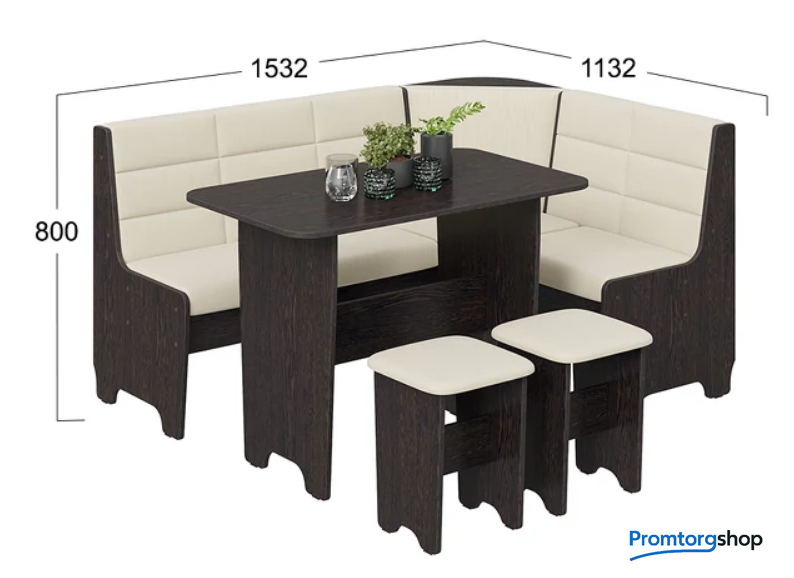 | Тип | обеденная группа для дома. Тип сборки: универсальная. Размеры мягкого уголка: 153.2×113.2×80 см; глубина сиденья: 36 см, высота спинки: 40 см |