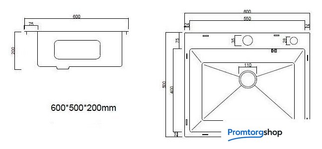 врезная на столешницу, нержавеющая сталь, размеры: 60x50 см