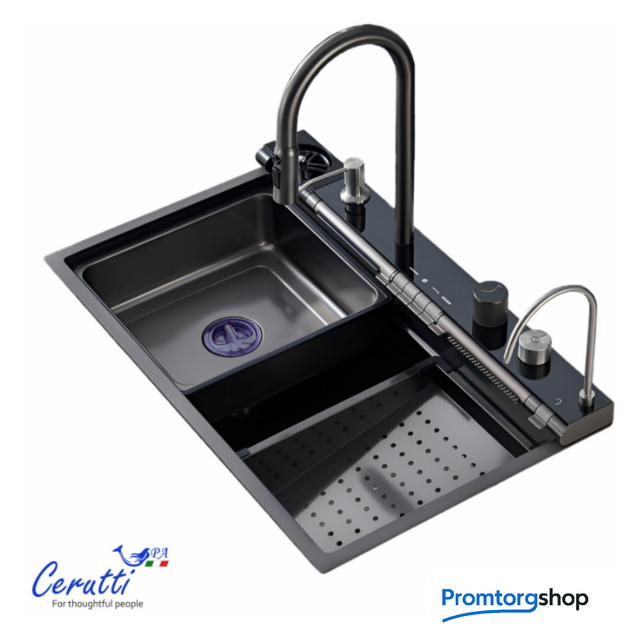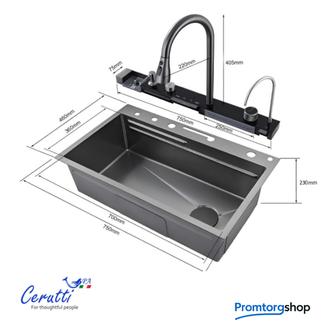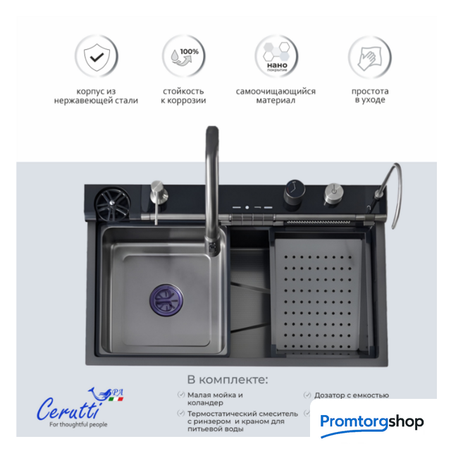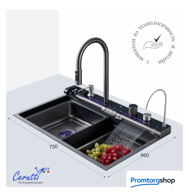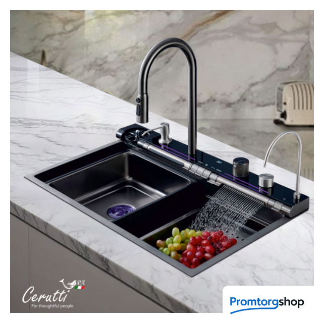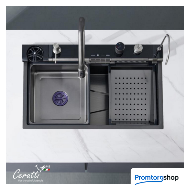 | Способ установки | врезная на столешницу. Многофункциональная мойка бренда Ceruttispa, выполненная из нержавеющей стали, толщиной 3мм – для ценителей комфорта, удобства и порядка на кухне! Она соединила в себе все самые необходимые на кухне аксессуары! Комплектация и особенности: Мойка из нержавеющей стали с рифленым PVD покрытием, способствующему ее легкой очистке (поверхность защищена от контакта с маслами и жирами, являющимися основными элементами загрязнения на кухне) и повышенной износостойкости, так как она не подвержена царапинам и на ней не скапливается вода. Панель со встроенным LED-дисплеем, показывает текущую температуру воды и время. Температура регулируется поворотной ручкой. Дисплей не требует подключения к электричеству, так как его работа связана с напором воды. Термостатический смеситель, выполненный из латуни, установлен на панели. Выдвижной излив имеет 3 режима слива воды. Режимы легко переключаются простым нажатием кнопки на аэраторе. Дозатор мыла – нажатием на него сверху легко добавить необходимое количество моющего средства или мыла на загрязненную поверхность. Мойка высокого давления для мытья стаканов – работает при нажатии соответствующей кнопки на панели управления режимами мойки. Встроенный кран для очищенной воды, подходящий под дизайн мойки – нет необходимости приобретать дополнительный кран к установленному у Вас фильтру. Трубку от имеющегося очистителя воды можно подключить к крану и пользоваться привычной чистой питьевой водой. Клавишная панель переключения режимов – позволяет простым нажатием на клавишу выбрать нужный режим: каскадный водопад/ смеситель/ водопад/ мойка чашек. Слив воды в мойке осуществляется поворотом ручки регулятора. При необходимости Вы можете дополнительно установить измельчитель. Каскадный водопад – используется для мытья фруктов, овощей Слив водопад – идеален для мытья больших, ровных поверхностей, нуждающихся в интенсивной очистке. Коландер – для удобства разморозки продуктов, для промывки овощей и фруктов, мытья посуды с их дальнейшей сушкой при необходимости. Дополнительное удобство создает специальная «рельса» на мойке, по которой возможно перемещать коландер в выгодное положение (право/лево). Лоток для замачивания кухонных принадлежностей или продуктов. Дополнительное удобство создает специальная «рельса» на мойке, по которой возможно перемещать лоток в нужное положение (право/лево). Омыватель для стаканов нажимной Удобная поворотная панель каскадного водопада Кнопки для регулировки напора воды В комплекте есть все необходимое для установки мойки: сифоны, водосточная труба, шланги для подключения к водопроводу. Бутылка входит в комплект. Размер раковины: 750х460мм. Устанавливается на отверстие в столешнице, размерами 720х430мм. Внимание! Во избежание затекания воды в щели и стыки, необходима герметизация швов между мойкой и столешницей (стеной) герметиком! |