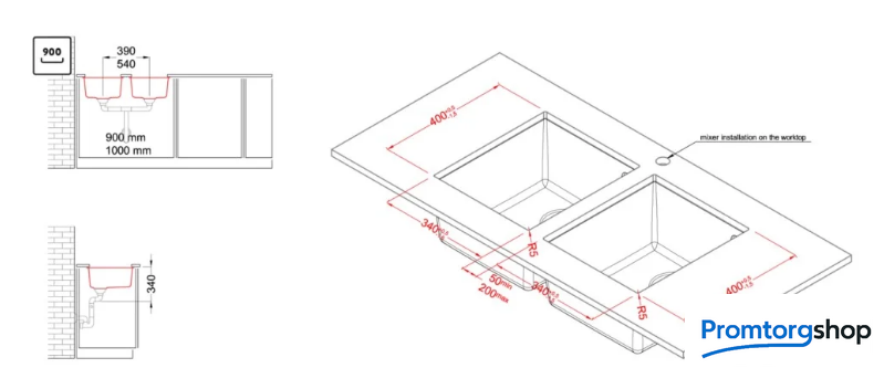 | Ширина | 340 x 400 мм + 340 x 400 мм R5 (Минимальная дистанция между мойками 50мм) |