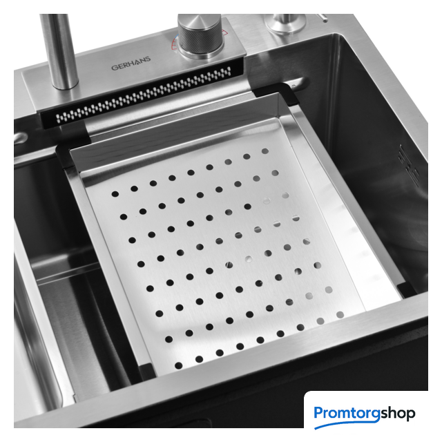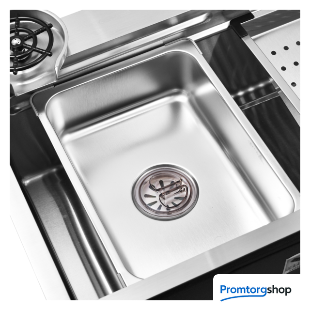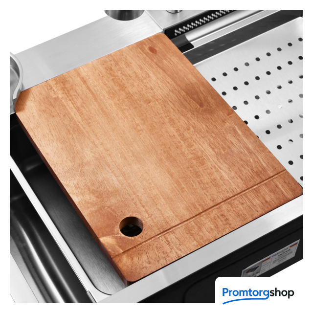| Комплектация | Многофункциональная мойка из нержавеющей стали. Смеситель с выдвижной лейкой + режим каскадного водопада. Ринзер для мытья стаканов и кружек. Чаша для разморозки. Коландер. Деревянная разделочная доска. Врезной дозатор для мыла. Сифон с гибкой подводкой. |