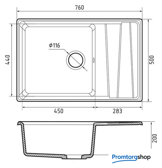врезная на столешницу, искусственный камень, размеры: 76x50 см, в шкаф 60 см