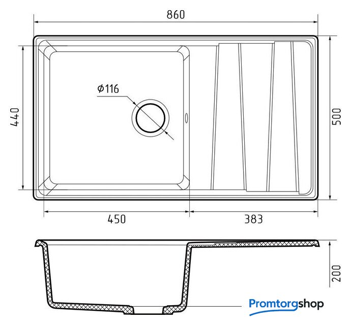 врезная на столешницу, искусственный камень, размеры: 86x50 см, в шкаф 60 см