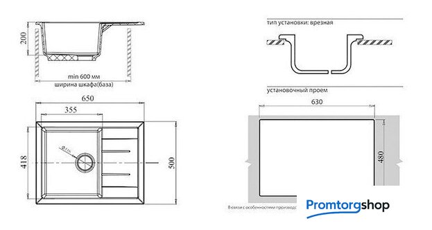 врезная на столешницу, искусственный камень, размеры: 65x49.5 см, в шкаф 60 см