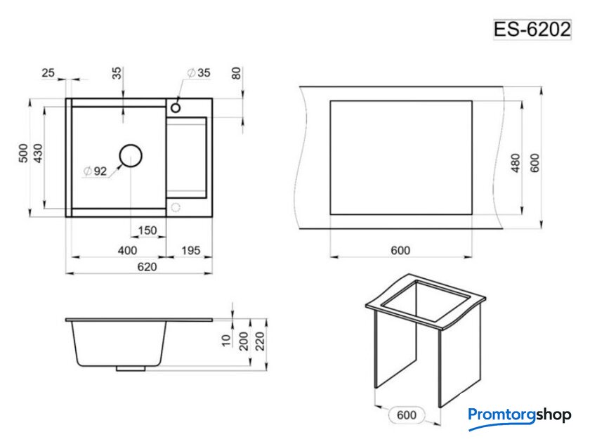 врезная на столешницу, искусственный камень, размеры: 50x62 см, в шкаф 60 см