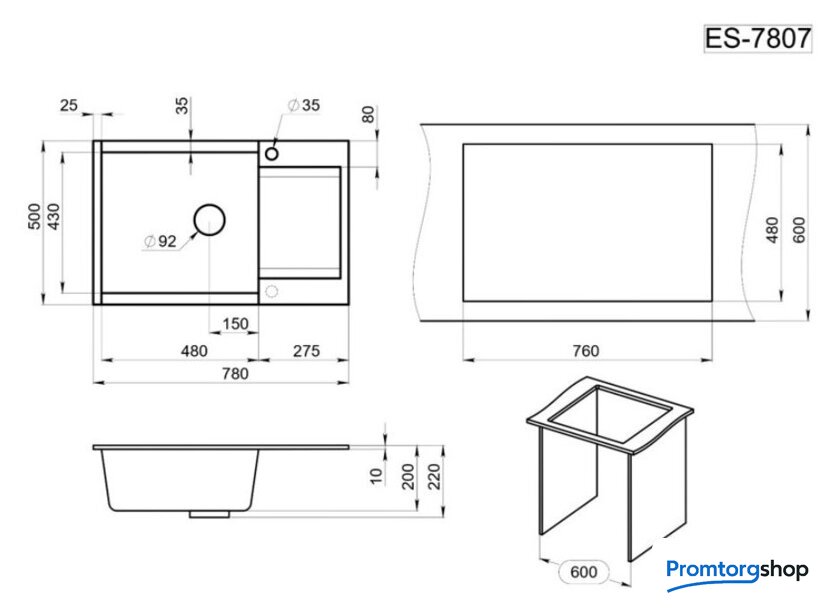врезная на столешницу, искусственный камень, размеры: 50x78 см, в шкаф 60 см