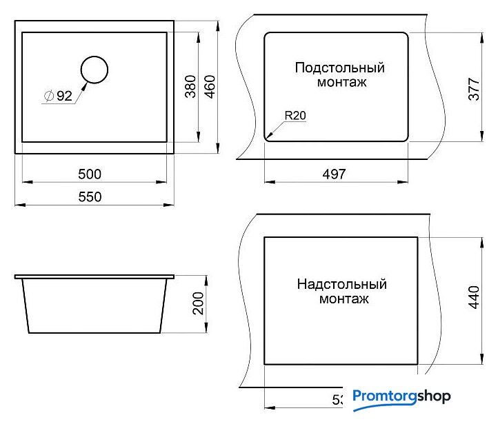 врезная на столешницу, искусственный камень, размеры: 55x46 см, в шкаф 60 см