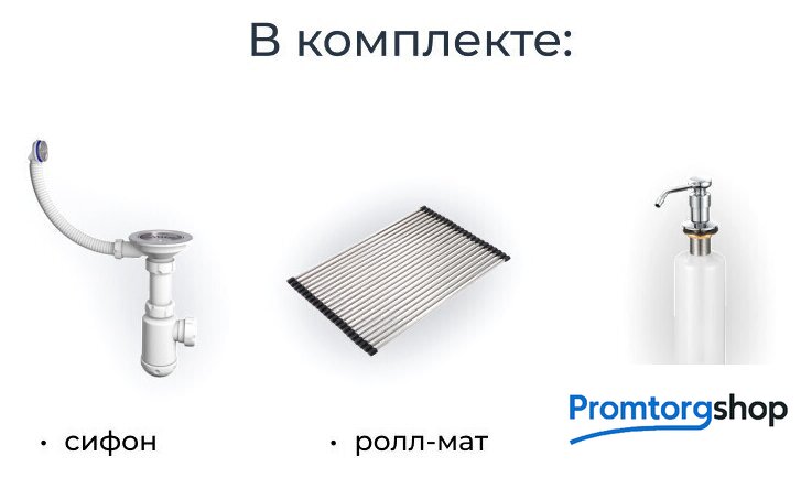 Комплектация | Сифон, дозатор для жидкого мыла (нерж) и ролл-мат |