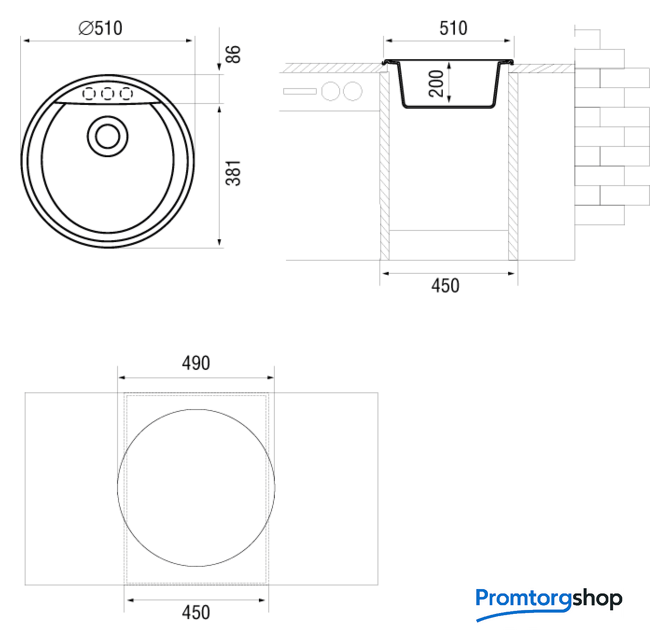 врезная на столешницу, искусственный камень, размеры: 51x51 см, в шкаф 45 см