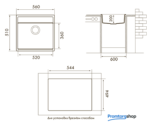 врезная на столешницу, искусственный камень, размеры: 56x51 см, в шкаф 60 см