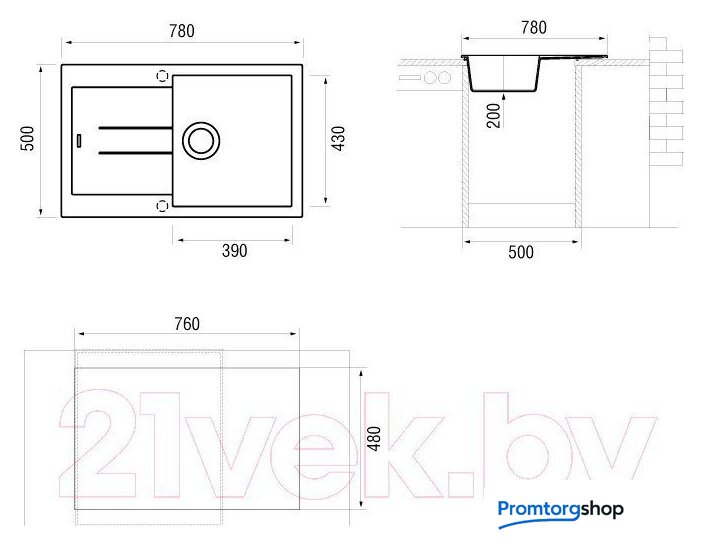 врезная на столешницу, искусственный камень, размеры: 78x50 см, в шкаф 60 см