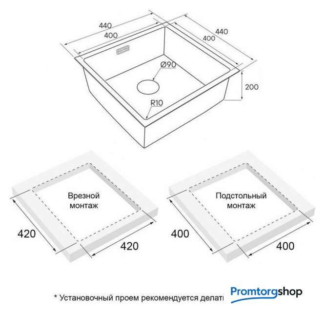врезная под столешницу/врезная на столешницу/врезная вровень со столешницей, нержавеющая сталь, размеры: 44x48 см, в шкаф 50 см