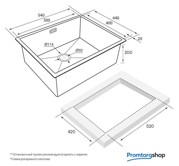 врезная на столешницу/врезная под столешницу, нержавеющая сталь, размеры: 44x54 см, в шкаф 60 см