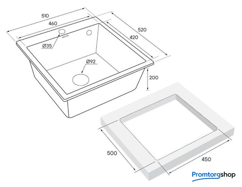 врезная на столешницу, искусственный камень, размеры: 51x52 см, в шкаф 60 см