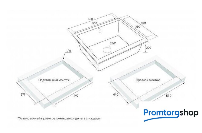врезная на столешницу/врезная под столешницу/врезная вровень со столешницей, искусственный камень, размеры: 55x46 см, в шкаф 60 см