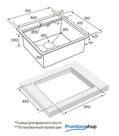 врезная на столешницу/врезная вровень со столешницей, нержавеющая сталь, размеры: 51x51 см, в шкаф 50 см