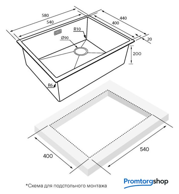 врезная на столешницу/врезная под столешницу/врезная вровень со столешницей, нержавеющая сталь, размеры: 58x44 см