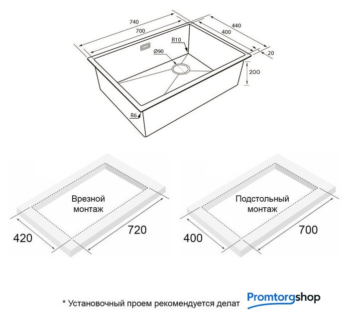 врезная на столешницу/врезная под столешницу/врезная вровень со столешницей, нержавеющая сталь, размеры: 74x44 см, в шкаф 80 см