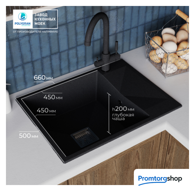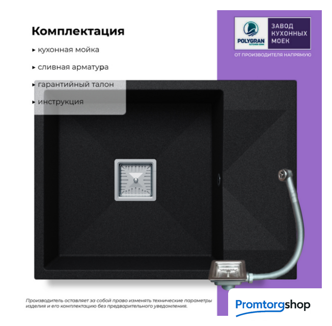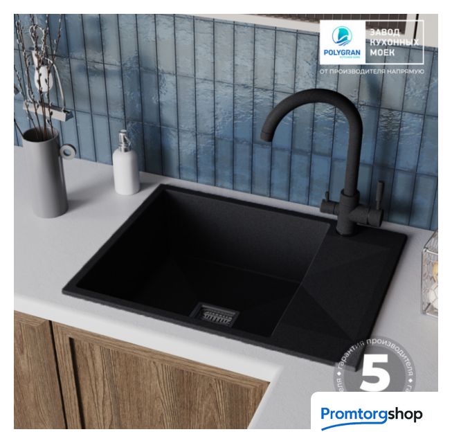 | Способ установки | врезная на столешницу. Polygran — российский бренд, специализирующийся на производстве высококачественных кухонных моек из искусственного камня. Компания успешно сочетает современные технологии и стильный дизайн, предлагая долговечные и функциональные изделия. Мойки ТМ Polygran обладают высокой механической прочностью благодаря высокотехнологичному производству литья материала, 80% составляет натуральная мраморная крошка и 20% экологически чистого связующего элемента. Прочность изделий сравнима с прочностью натурального гранита. Материал обладает высокой термоустойчивостью, что позволяет использовать мойку при высоких перепадах температур, а добавление специально разработанной добавки в связующий элемент (гелькоут) позволит легко удалить любые загрязнения с поверхности мойки. |