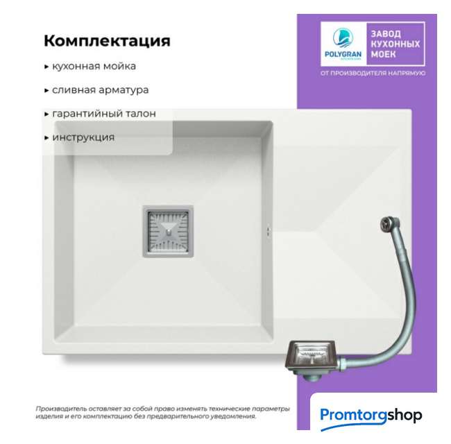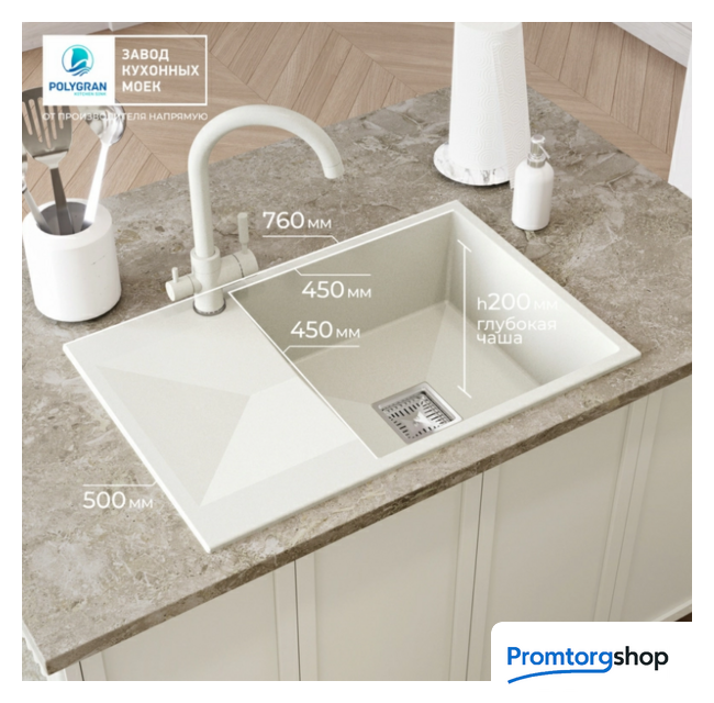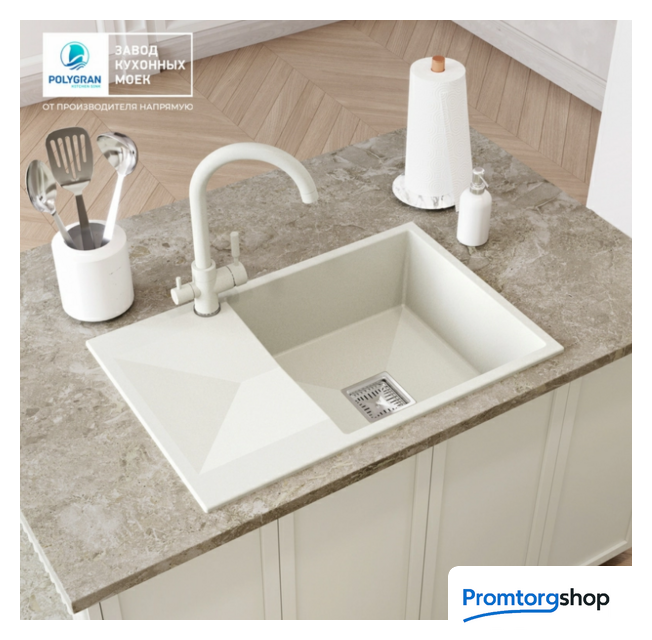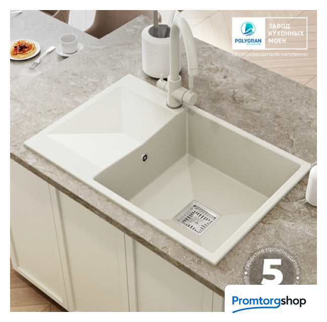 | Способ установки | врезная на столешницу. Polygran — российский бренд, специализирующийся на производстве высококачественных кухонных моек из искусственного камня. Компания успешно сочетает современные технологии и стильный дизайн, предлагая долговечные и функциональные изделия. Мойки ТМ Polygran обладают высокой механической прочностью благодаря высокотехнологичному производству литья материала, 80% составляет натуральная мраморная крошка и 20% экологически чистого связующего элемента. Прочность изделий сравнима с прочностью натурального гранита. Материал обладает высокой термоустойчивостью, что позволяет использовать мойку при высоких перепадах температур, а добавление специально разработанной добавки в связующий элемент (гелькоут) позволит легко удалить любые загрязнения с поверхности мойки. |
