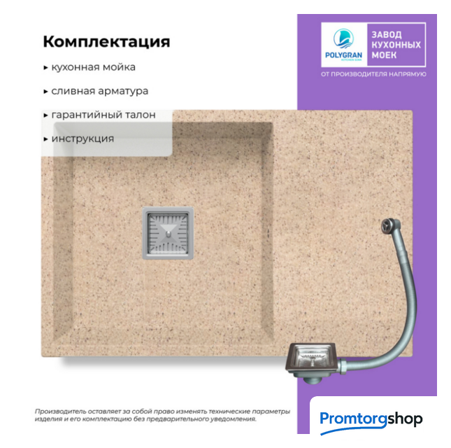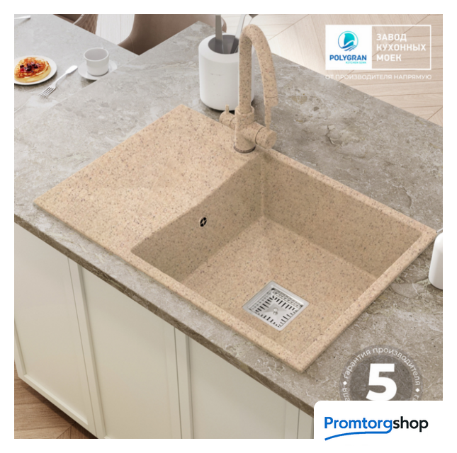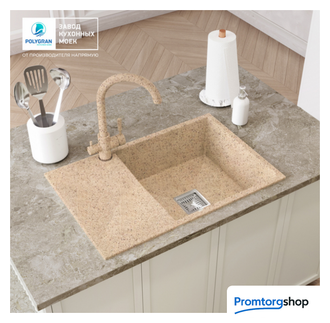 | Способ установки | врезная на столешницу. Polygran — российский бренд, специализирующийся на производстве высококачественных кухонных моек из искусственного камня. Компания успешно сочетает современные технологии и стильный дизайн, предлагая долговечные и функциональные изделия. Мойки ТМ Polygran обладают высокой механической прочностью благодаря высокотехнологичному производству литья материала, 80% составляет натуральная мраморная крошка и 20% экологически чистого связующего элемента. Прочность изделий сравнима с прочностью натурального гранита. Материал обладает высокой термоустойчивостью, что позволяет использовать мойку при высоких перепадах температур, а добавление специально разработанной добавки в связующий элемент (гелькоут) позволит легко удалить любые загрязнения с поверхности мойки. |