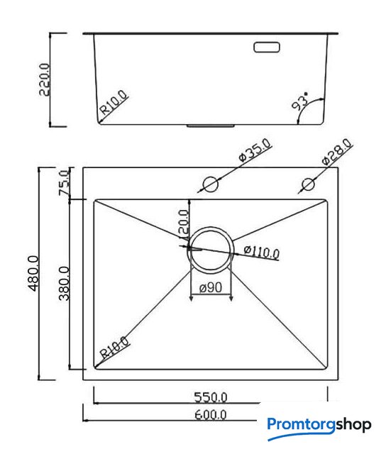 врезная на столешницу, нержавеющая сталь, размеры: 60x48 см