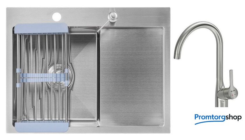 | Комплектация | Мойка кухонная Saniteco 6550-L (с сифоном, дозатором и коландером); Смеситель AM.PM Spike F9S07011 (сатин) |