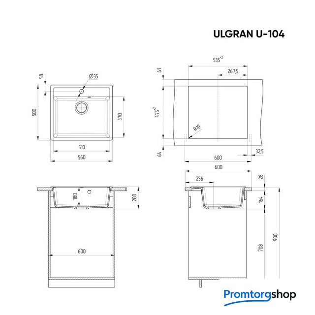 врезная на столешницу, искусственный камень, размеры: 56x49.5 см, в шкаф 60 см