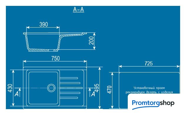 врезная на столешницу, искусственный камень, размеры: 75x49.5 см, в шкаф 60 см