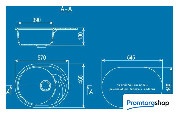 врезная на столешницу, искусственный камень, размеры: 57x46.5 см, в шкаф 45 см