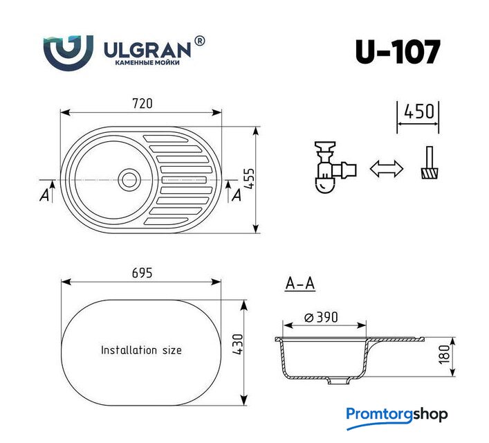 врезная на столешницу, искусственный камень, размеры: 72x45.5 см, в шкаф 45 см