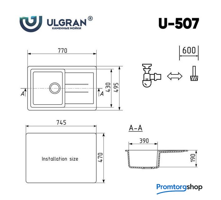 врезная на столешницу, искусственный камень, размеры: 77x49.5 см, в шкаф 60 см