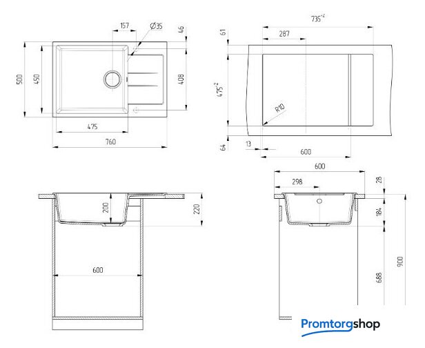 врезная на столешницу, искусственный камень, размеры: 76x50 см, в шкаф 60 см