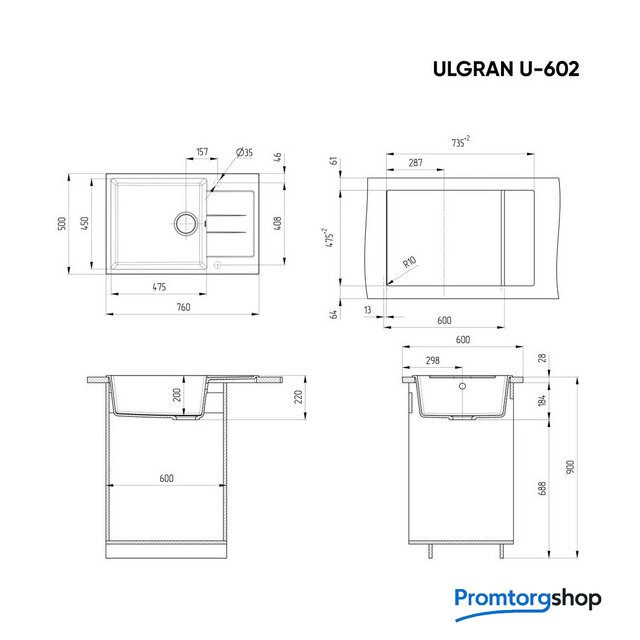 врезная на столешницу, искусственный камень, размеры: 50x76 см, в шкаф 60 см
