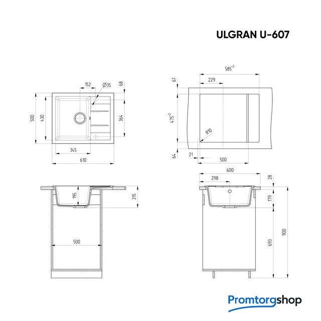 врезная на столешницу, искусственный камень, размеры: 61x50 см, в шкаф 50 см