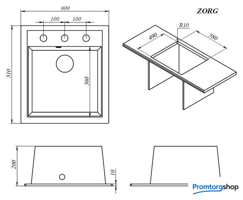 врезная на столешницу, искусственный камень, размеры: 60x51 см, в шкаф 60 см