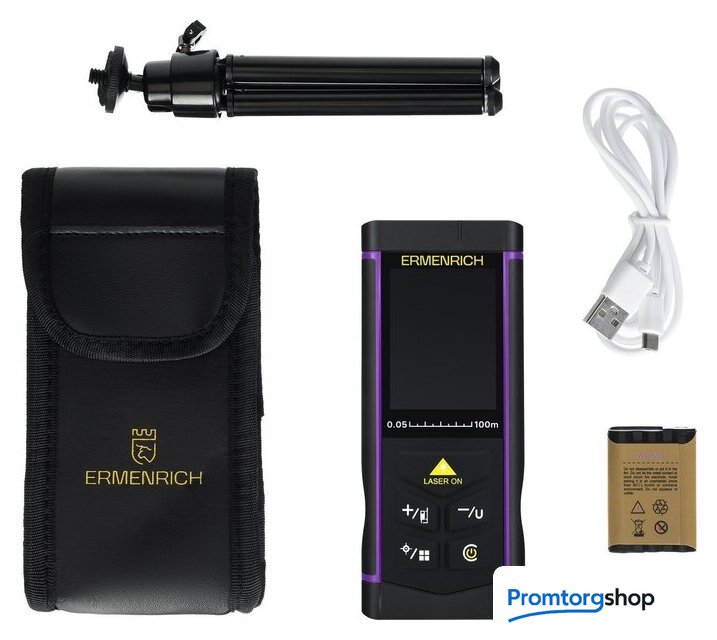 Комплект поставки | Лазерная рулетка, настольный штатив, ремешок на руку, аккумулятор, USB-кабель для зарядки, чехол, инструкция по эксплуатации и гарантийный талон. |