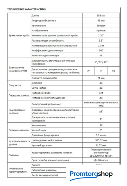 | Комплект поставки | Теодолит; Юстировочная шпилька; Фланель протирочная; Кисточка; Отвертка; Батарейный отсек; Зарядное устройство; Инструкция; Кейс. |