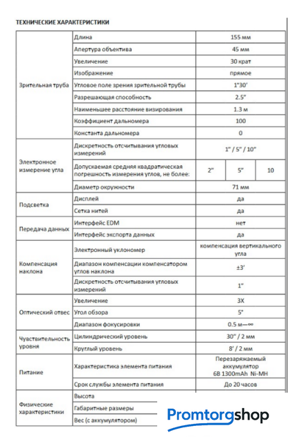 | Комплект поставки | Теодолит; Юстировочная шпилька; Фланель протирочная; Кисточка; Отвертка; Батарейный отсек; Зарядное устройство; Инструкция; Кейс. |