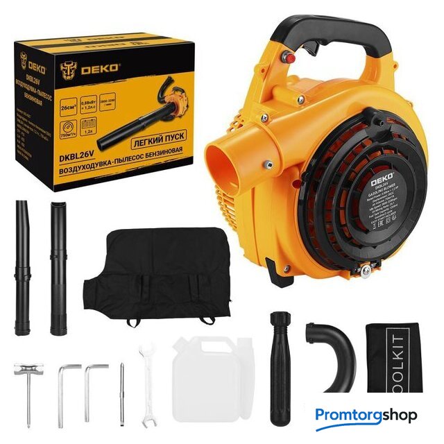 Комплектация | Воздуходувка - 1 шт.Верхняя труба подачи воздуха - 1 шт.Нижняя труба подачи воздуха - 1 шт.Гнутая труба - 1 шт.Верхняя труба пылесоса - 1 шт.Нижняя труба пылесоса - 1 шт.Мешок пылесборник - 1 шт.Емкость для топлива - 1 шт.Отвертка двусторонняя - 1 шт.Ключ гаечный - 1 шт.Ключ шестигранный - 2 шт.Ключ свечной - 1 шт.Сумка для инструментов - 1 шт.Руководство по эксплуатации - 1 шт.Коробка |