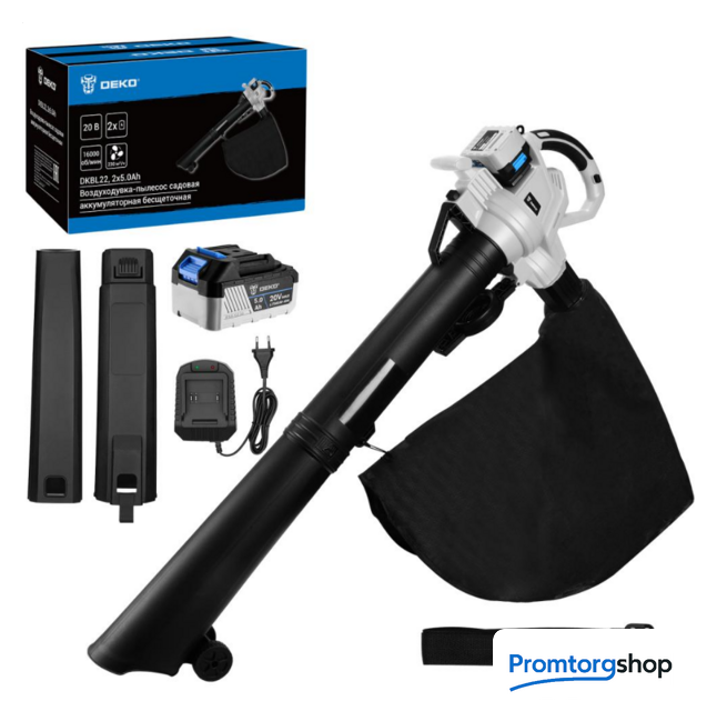 Конструктивное исполнение | Воздуходувка-пылесос садовая аккумуляторная бесщеточная DEKO DKBL22 предназначена для уборки территории, сбора сухих листьев возле дома и в саду. Совмещает в себе функцию обдува, всасывания и мульчирования. Для работы в режиме всасывания к воздуходувке крепится мешок для мусора (входит в комплект). Функция упрощенного запуска обеспечивает плавный старт без рывков и отдачи. |