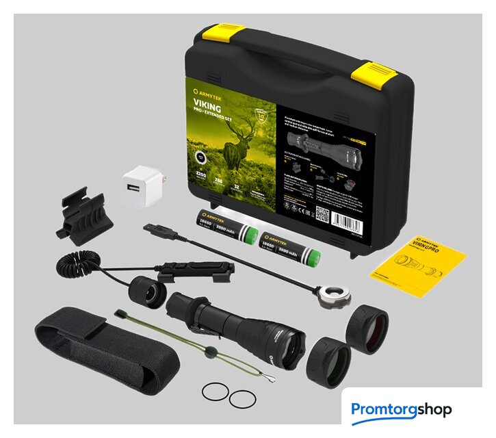 Комплект поставки | - Фонарь (Armytek Viking Pro Magnet USB);- 2 аккумулятора 18650 Li-Ion 3500 мАч;- 2 цветных фильтра (красный, зеленый);- Магнитная выносная кнопка MRS-01 с креплением и липучкой фиксации;- Магнитное подствольное крепление AWM-03;- Сетевой адаптер;- Стальная клипса;- Магнитное зарядное устройство AMC-03;- Ремешок на руку из паракорда;- Нейлоновый чехол;- Силиконовый грип-упор;- 2 запасных уплотнительных кольца;- Инструкция. |