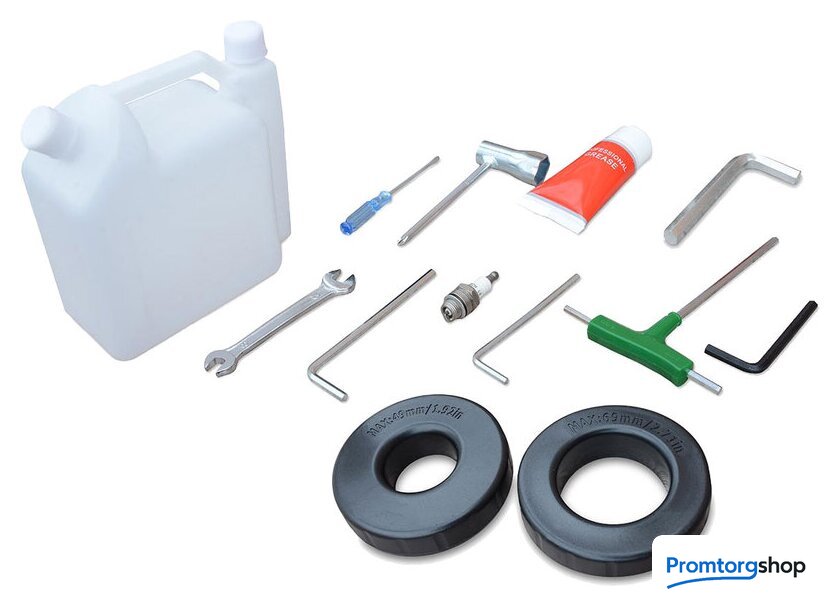 Комплектация | •Канистра для топливной смеси – 1 шт. •Воронка – 1 шт. •Набор инструмента: накидной ключ, гаечный ключ, свечной ключ, отвертка, шестигранные ключи - 3шт. •Насадка диаметром 49 мм - 1шт •Насадка диаметром 69 мм - 1шт •Насадка диаметром 100 мм - 1шт |