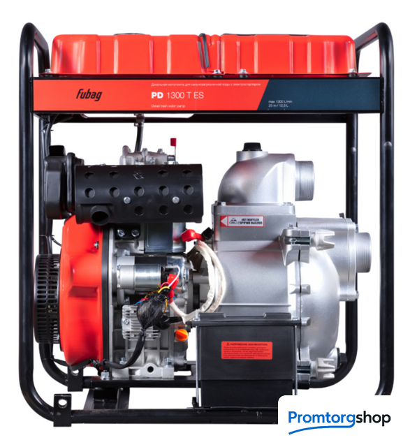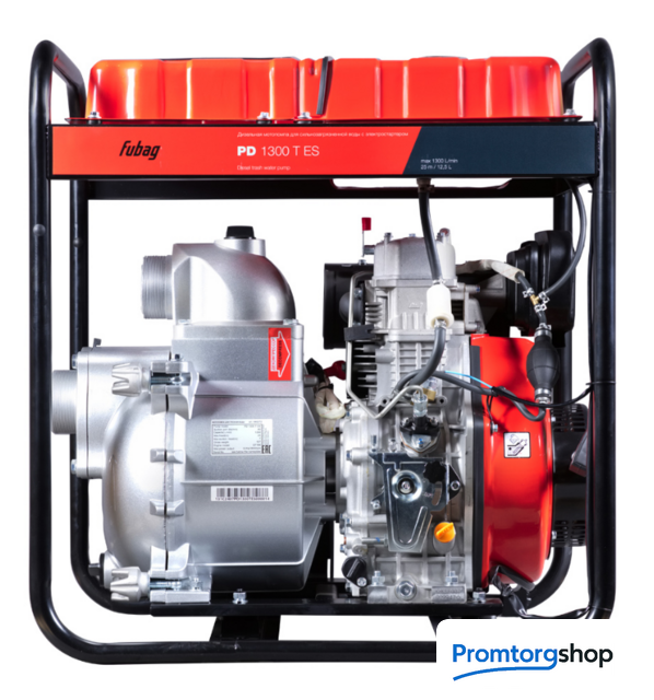Применение | Дизельная мотопомпа FUBAG для сильнозагрязненной воды - автономно работающее устройство производительностью 1300 л/мин, которое перекачивает грязную воду с абразивными включениями диаметром до 27 мм. Помпа PD 1300 T ES способна откачивать воду с песком и мелкими камнями. Оснащена дизельным двигателем с воздушным охлаждением мощностью 6,9, предназначенным для тяжелых условий эксплуатации. Графитовые сальники и специальная усиленная конструкция улиты насоса, изготовленной из термически обработанного чугуна, гарантируют повышенный ресурс работы. Дизельная помпа FUBAG оптимальна для работ в сельском хозяйстве, на строительных площадках, промышленных предприятиях, в коммунальном хозяйстве, при разработке карьеров, шахт, очистки загрязненных водоемов, откачки котлованов, в условиях паводка. Дизельный двигатель легко запускается с помощью электростартера. Металлическая рама и специальная металлическая накладка над насосной частью надежно защищают рабочие узлы помпы от повреждений в условиях интенсивного использования. Эргономичная конструкция помпы обеспечивает удобный доступ для заливки воды в насосную часть. Вместительный топливный бак (12,5 л) способствует длительной бесперебойной работе мотопомпы без дозаправки в течение 7,5 часов. Все основные рабочие узлы легко доступны для проведения профилактических работ. Для транспортировки могут оснащаться стандартным набором колес и ручек FUBAG (опция). Комплектация Мотопомпа - 1 шт. Алюминиевый патрубок с гайкой - 2 шт. Резиновое уплотнение соединений патрубков - 2 шт. Фильтр металлический для грязной воды, сетка 27м - 1 шт. Хомут - 3 шт. Воронка заливная для воды - 1 шт. Воронка заливная для масла - 1 шт. Комплект опор - 3 шт. Набор ключей - 1 шт. Отвертка - 1 шт. Ключ зажигания - 2 шт. Инструкция Коробка |
